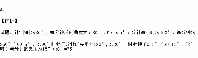 在时刻8∶30时,时钟上的时针与分针间的夹角是
