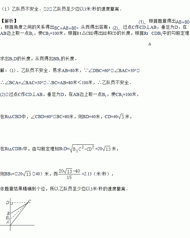 在军事上,常用时钟表示方向角(读数对应的时针方向),如正北为12点方向,北偏西30°为11点方向.在一次反恐演习中,甲队员在A处掩护,乙队员从A处沿12点方向以40米/分的速度前进,2分钟后到达B处.这时,甲队员发现在自己的1点方向的C处有恐怖分子,乙队员发现C处位于自己的2点方向(如图).假设距恐怖分子100米以外为安全位置.