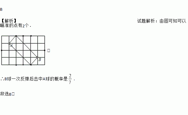 桌面上有A、B两球,若要将B球射向桌面任意一边的黑点,则B球一次反弹后击中A球的概率是( )
