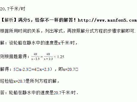 A、B两地相距48千米,一艘轮船从A地顺流航行至B地,又立即从B地逆流返回A地,逆流返回所用时间是顺流航行所用时间的2倍,已知水流速度为4千米/时.求:该轮船在静水中的速度多少?