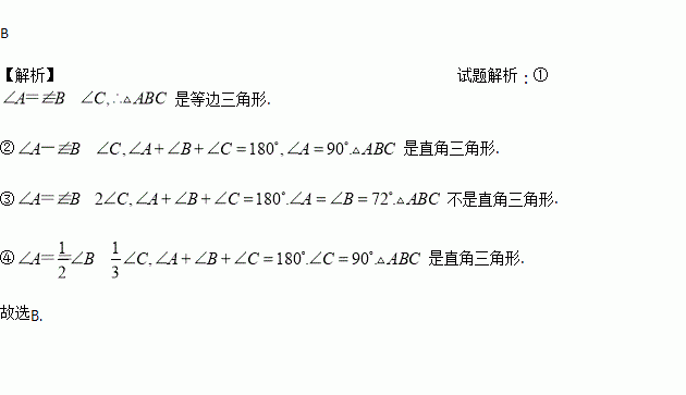 以下四个三角形分别满足以下条件:①∠A=∠B=∠C;②∠A-∠B=∠C;③∠A=∠B=2∠C;④∠A=∠B=∠C,其中是直角三角形的个数为( )