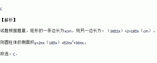 已知矩形的周长为36m,矩形绕着它的一条边旋转形成一个圆柱,设矩形的一条边长为xm,圆柱的侧面积为ym2 , 则y与x的函数关系式为( )