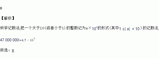 根据央视报道,去年我国汽车尾气排放总量大约为47 000 000吨将47 000 000用科学记数法表示为![]()