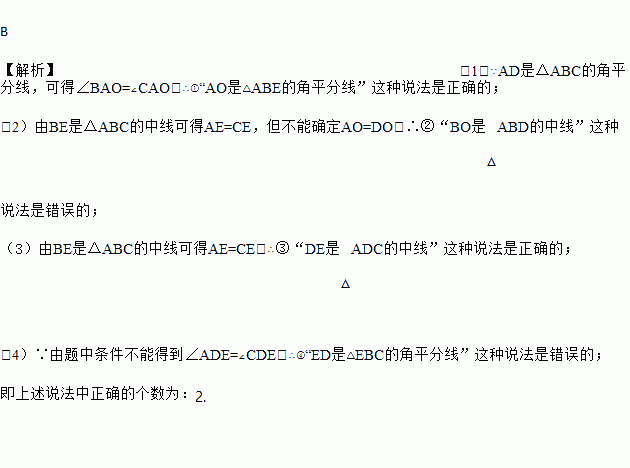 如图,△ABC的角平分线AD、中线BE相交于点O,则①AO是△ABE的角平分线;②BO是△ABD的中线;③DE是△ADC的中线;④ED是△EBC的角平分线.4个结论中正确的有( )