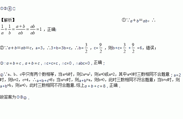 ③若a=b=c,则abc=0;④若a、b、c中只有两个数相等,则a+b+c=8.