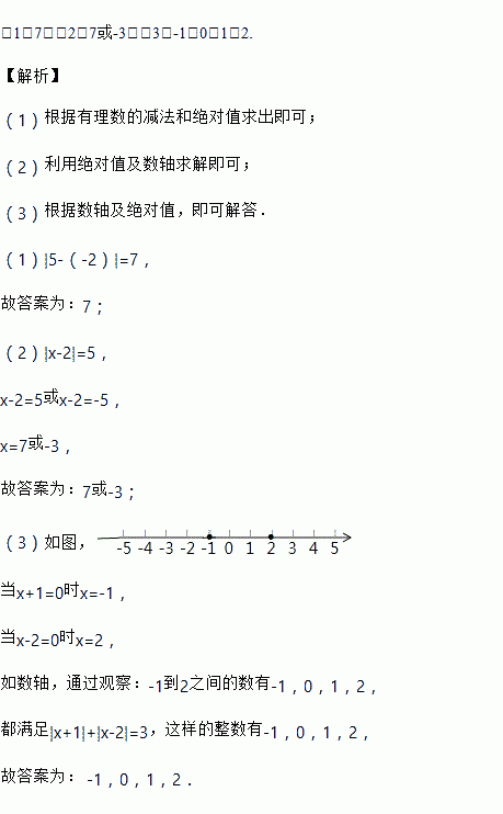 表示5与-2之差的绝对值,实际上也可理解为5与-2两数在数轴上所对应的两点之间的距离,试探索: