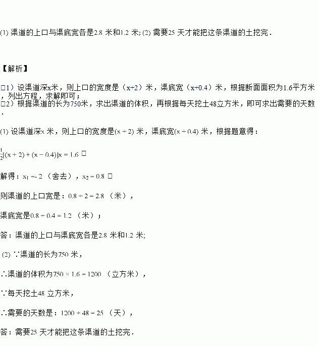 某林场计划修一条长,断面为等腰梯形的渠道,断面面积为,上口宽比渠深多,渠底比渠深多