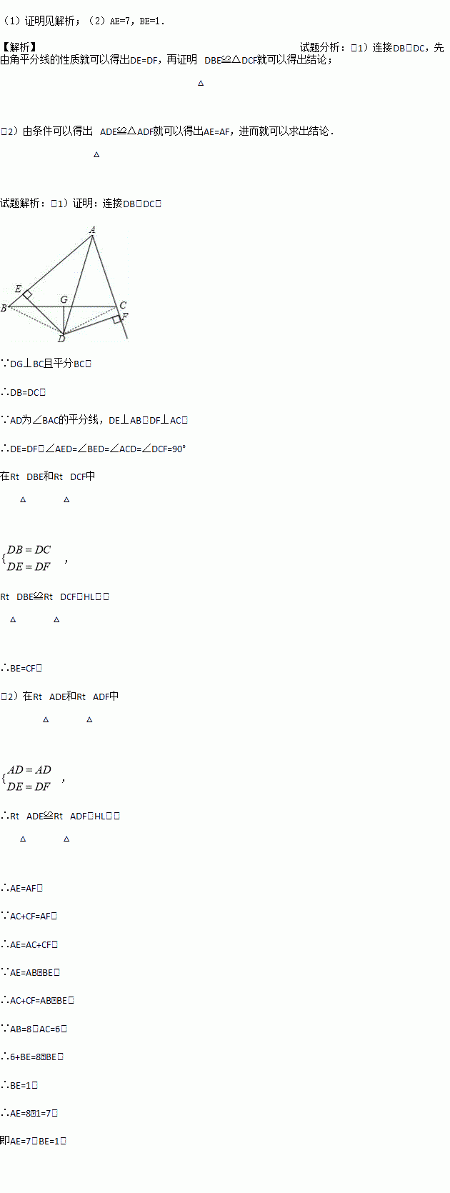 如图,△ABC中,AD平分∠BAC,DG⊥BC且平分BC,DE⊥AB于E,DF⊥AC于F.