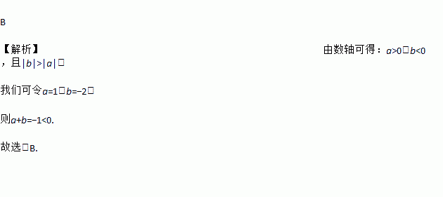B 【解析】由数轴可得:a>0,b<0,且|b|>|a|, 我们可令a=1,b=?2, 则a+b=?1<0. 故选:B.