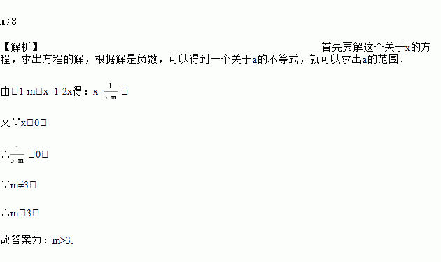 若关于x的方程(1-m)x=1-2x的解是一个负数,则m的取值范围是_________.