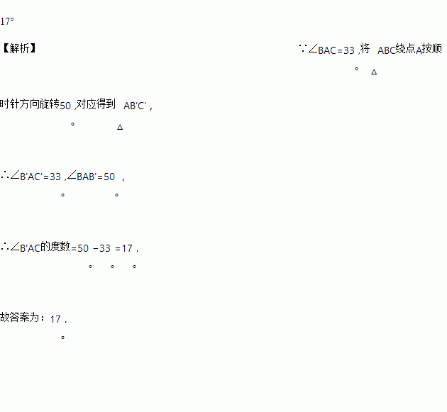 (2016·江西中考)如图所示,△ABC中,∠BAC=33°,将△ABC绕点A按顺时针方向旋转50°,对应得到△AB′C′,则∠B′AC的度数为________.