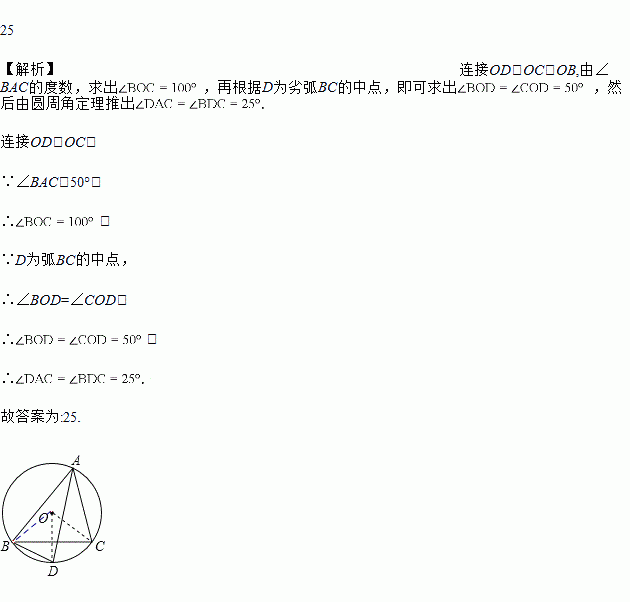 如图,△ABC内接于圆O,D为劣弧BC的中点,∠BAC=50°,则∠DBC是______°.