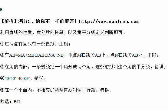 ①过两点有且只有一条直线;②有AB=MA+MB,AB<NA+NB,则点M在线段AB上,点N在线段AB外;③一条射线把一个角分成两个角,这条射线叫这个角的平分线;④40°50′=40.5°;⑤不相交的两条直线叫做平行线.