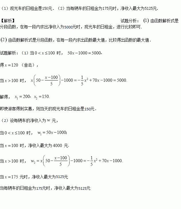旅游公司在景区内配置了50辆观光车供游客租赁使用,假定每辆观光车一天内最多能出租一次,且每辆车的日租金是x元,发现每天的营运规律如下:当x不超过100元时,观光车能全部租出;当x超过100元时,每辆车的日租金每增加5元,租出去的观光车就会减少1辆,已知所有观光车每天的管理费是1000元.