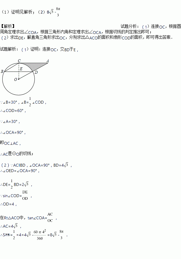 如图,点B、C、D都在⊙O上,过C点作CA∥BD交OD的延长线于点A,连接BC,∠B=∠A=30°,BD=4