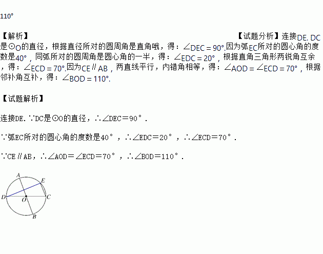 如图,在⊙O中,AB,CD是两条直径,弦CE∥AB,弧EC所对的圆心角的度数是40°,求∠BOD的度数.