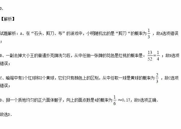 A.在“石头、剪刀、布”的游戏中,小明随机出的是“剪刀”
