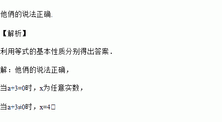 老师在黑板上写了一个等式:(a+3)x=4(a+3).王聪说x=4,刘敏说不一定,当x≠4时,这个等式也可能成立.你认为他俩的说法正确吗?用等式的性质说明理由.