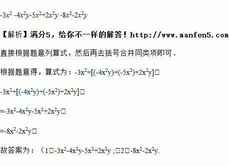单项式-3x2加上单项式-4x2y,-5x2,2x2y的和,列算式为________,计算后的结果是________.
