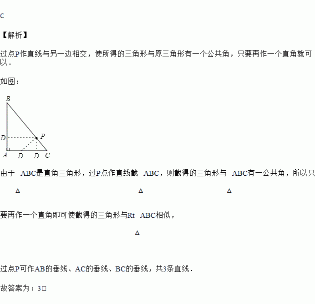 如图,是直角三角形的斜边上异于、的一点,过点作直线截三角形,使截得的三角形于三角形相似,则过点满足这样条件的直线最多有( )条.