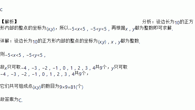 在平面直角坐标系中,我们把横、纵坐标都是整数的点叫做整点,且规定:正方形内部 不包含边界上的点.观察如图所示的中心在原点、一边平行于 x 轴的正方形:边长为 1 的正方形内部有 1 个整点,边长为 2 的正方形内部有 1 个整点,边长为 3 的正方形内部 有 9 个整点,…,则边长为 10 的正方形内的整点个数为( )