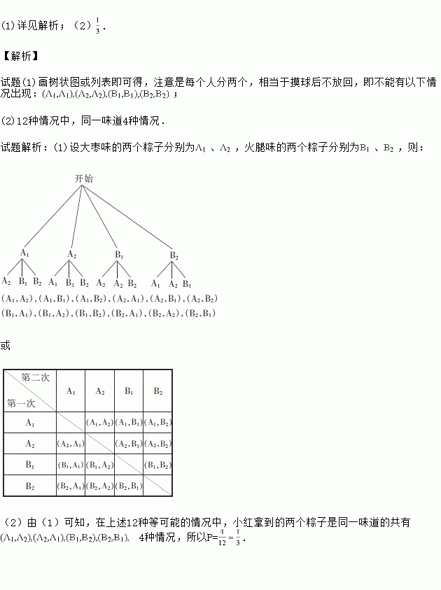 (1)请你用树状图或列表的方法表示小红拿到的两个粽子的所有可能性;