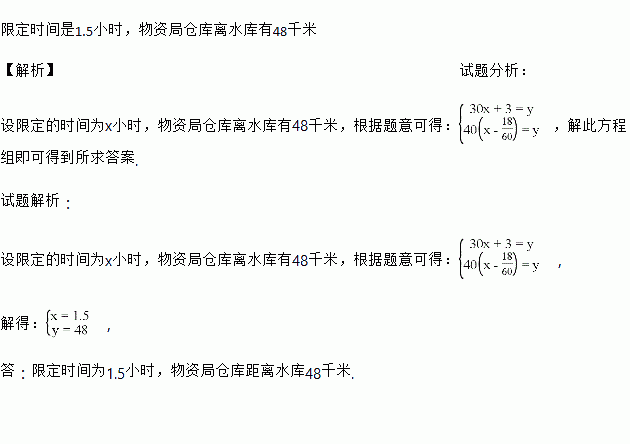 抗洪指挥部的一位驾驶员接到一个防洪的紧急任务,要在限定的时内把一批抗洪物质从物质局运到水库,这辆车如果按每小时30千米的速度行驶在限定的时间内赶到水库,还差3千米,他决定以每小时40千米的速度前进,结果比限定时间早到18分钟,问限定时间是几小时?物质局仓库离水库有多远?