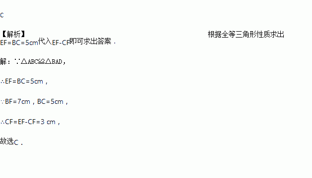 如图,△ABC≌△DEF,点A与D,B与E分别是对应顶点,且测得BC=5cm,BF=7cm,则EC长为( )