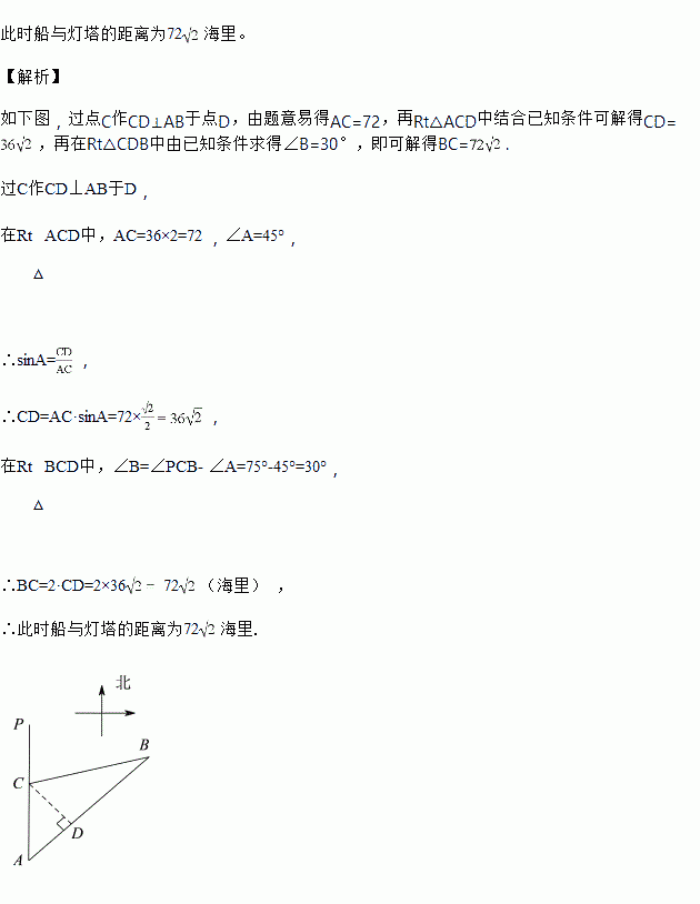 一船以每小时36海里的速度向正北航行到A处, 发现它的东北方向有灯塔B,船继续向北航行2小时到达C处,发现灯塔B在它的北偏东75°方向,求此时船与灯塔的距离。(结果保留根号)