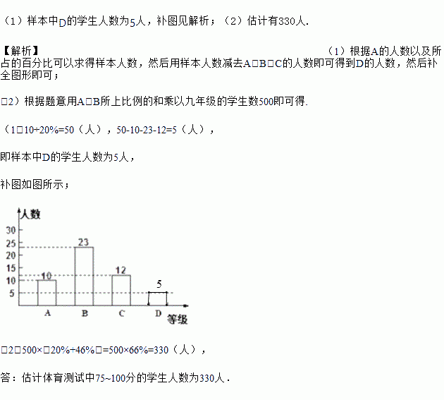 (2)若该校九年级有500名学生,请你用此样本估计体育测试中75~100分的学生人数.