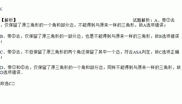 C 【解析】试题解析:A、带①去,仅保留了原三角形的一个角和部分边,不能得到与原来一样的三角形,故A选项错误; B、带②去,仅保留了原三角形的一部分边,也是不能得到与原来一样的三角形,故B选项错误; C、带③去,不但保留了原三角形的两个角还保留了其中一个边,符合ASA判定,故C选项正确; D、带①和②去,仅保留了原三角形的一个角和部分边,同样不能得到与原来一样的三角形,故D...