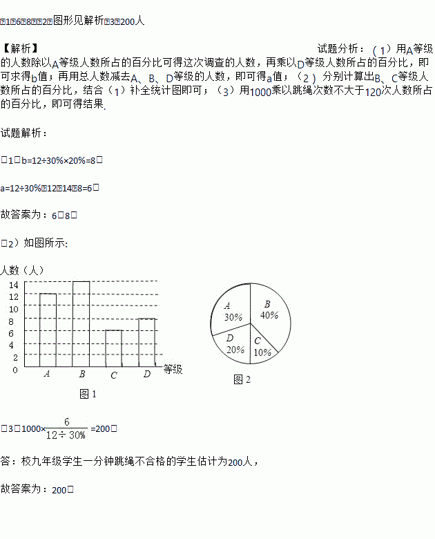 (1)6,8;(2)图形见解析(3)200人 【解析】试题分析:(1)用A等级的人数除以A等级人数所占的百分比可得这次调查的人数,再乘以D等级人数所占的百分比,即可求得b值;再用总人数减去A、B、D等级的人数,即可得a值;(2) 分别计算出B、C等级人数所占的百分比,结合(1)补全统计图即可;(3)用1000乘以跳绳次数不大于120次人数所占的百分比,即可得结果. 试题解析: (...