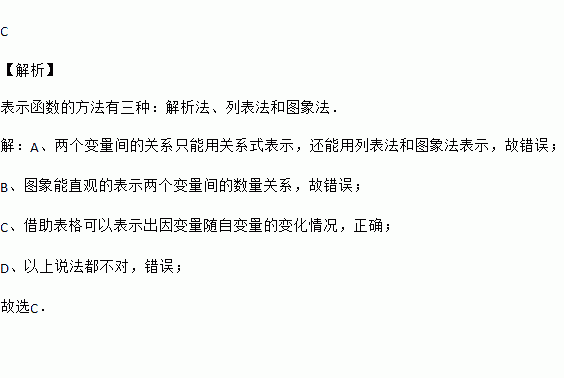 C 【解析】 表示函数的方法有三种:解析法、列表法和图象法. 【解析】 A、两个变量间的关系只能用关系式表示,还能用列表法和图象法表示,故错误; B、图象能直观的表示两个变量间的数量关系,故错误; C、借助表格可以表示出因变量随自变量的变化情况,正确; D、以上说法都不对,错误; 故选C.