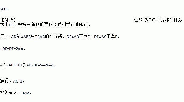 如图,AD是△ABC中∠BAC的平分线,DE⊥AB于点E,DF⊥AC于点F,DE=2cm,AB=4cm,S△ABC=7cm2,则AC的长为_________.