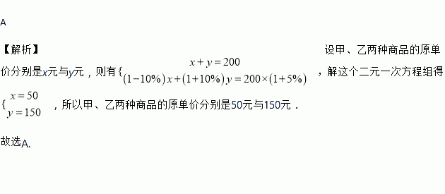 价后甲、乙两种商品的单价和比原单价和提高了5%,求甲、乙两种商品的原单价分别是( )