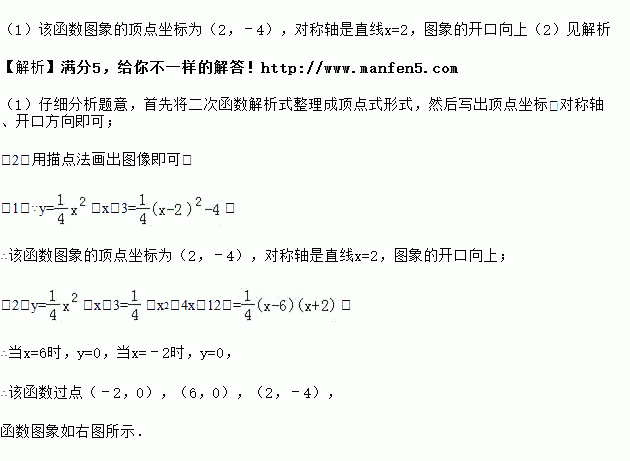 (1)用配方法求函数图象顶点坐标、对称轴,并写出图象的开口方向;
