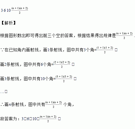 如下图,在已知角内画射线,画1条射线,图中共有____个角;画2条射线,图中共有___个角;画3条射线,图中共有____个角;求画n条射线所得的角的个数是____.