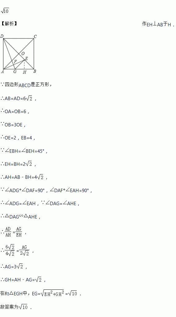 如图,正方形ABCD中,对角线AC、BD交于点O,点E是OB上一点,且OB=3OE,连接AE,过点D作DG⊥AE于点F,交AB边于点G,连接GE,若AD=6,则GE的长是_____.