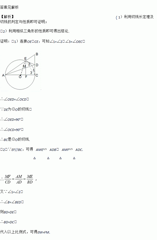 求证:(1)BC是⊙O的切线; (2)EM=FM。