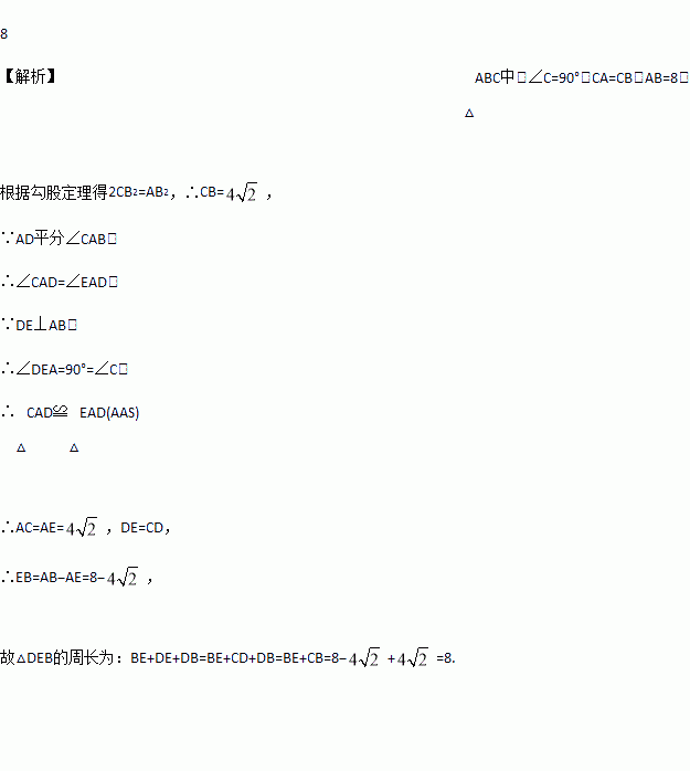 如图,△ABC中,∠C=90°,CA=CB,AD平分∠CAB.交BC于D,DE⊥AB于E,且AB=8,△DEB的周长为_____.