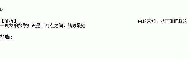 D 【解析】由题意知,能正确解释这一现象的数学知识是:两点之间,线段最短. 故选D.