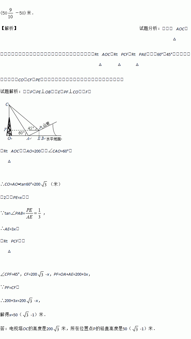 如图所示,某人在山坡坡脚A处测得电视塔尖点C 的仰角为60°,沿山坡向上走到P处再测得C的仰角为45°,已知OA=200米,山坡坡度为
