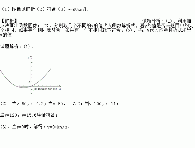 (1)图像见解析(2)符合(3)v=90km/h 【解析】试题分析:(1)、利用描点法画出函数图像;(2)、分别取几个不同的x的值代入函数解析式,看y的值是否与题目中的完全相同,如果完全相同就符合,如果有一个不相同就不符合;(3)、将s=9代入函数解析式求出v的值. 试题解析:(1)、 (2)、当v=60,s=4.2;当v=80,s=7.2;当v=100,s=11; 当v=...