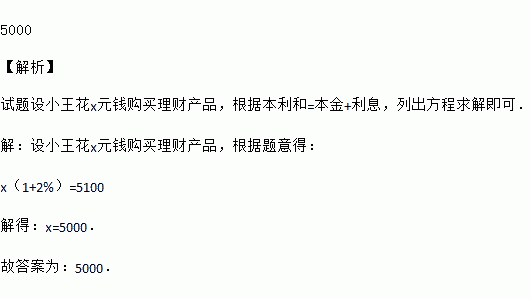 小王用一笔钱购买了某款一年期年利率为2%的理财产品,到期支取时得本利和为5100元,则当时小王花________元钱购买理财产品.