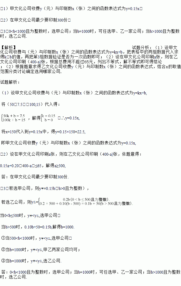 (1)甲文化公司收费y(元)与印制数x(张)之间的函数表达式为y=0.15x; (2)在甲文化公司最少要印制300份; (3)01000且为整数时,选乙公司. 【解析】试题分析:(1)设甲文化公司收费与(元)与印制数x(张)之间的函数表达式为y=kx+b,把表格中的两组数据代入求得k、b的值,再把第...