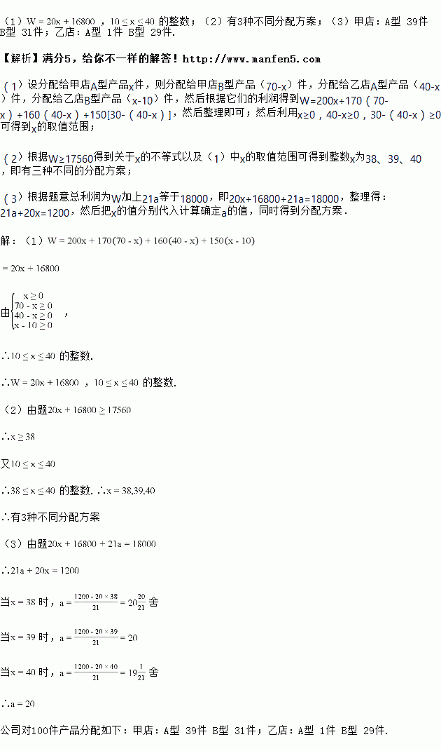 某公司有A型产品40件,B型产品60件,分配给下属甲、乙两个商店销售,其中70件给甲店,30件给乙店,且都能卖完.两商店销售这两种产品每件的利润(元)如下表.设分配给甲店A型产品件,这家公司卖出这100件产品的总利润为W(元).![]()