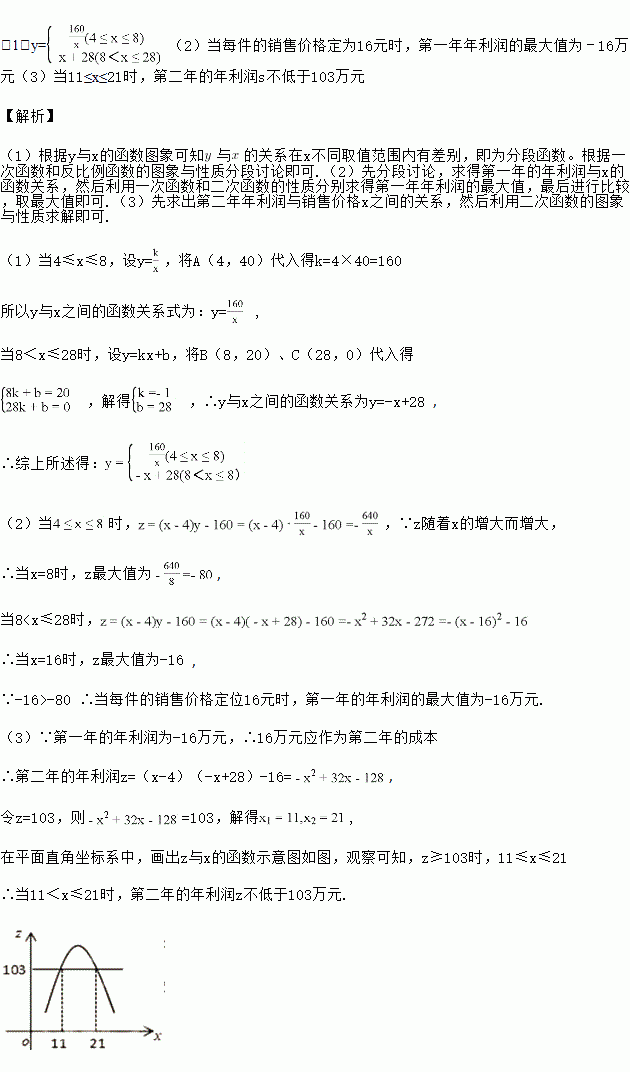 (3)假设公司的这种电子产品第一年恰好按年利润s(万元)取得最大值时进行销售,现根据第一年的盈亏情况,决定第二年将这种电子产品每件的销售价格x(元)定在8元以上(x>8),当第二年的年利润不低于103万元时,请结合年利润s(万元)与销售价格x(元/件)的函数示意图,求销售价格x(元/件)的取值范围.