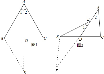 分析:(1)延长AD至E,使AD=ED,连接BE,证明△ADC≌△EDB,可利用全等三角形的性质得到AC=EB,∠E=∠2,再证明∠E=∠2,进而得到AB=EB,即可得AC=AB;