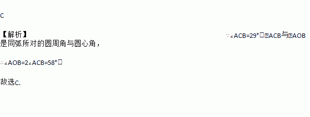 C 【解析】∵∠ACB=29°,∠ACB与∠AOB是同弧所对的圆周角与圆心角, ∴∠AOB=2∠ACB=58°. 故选C.