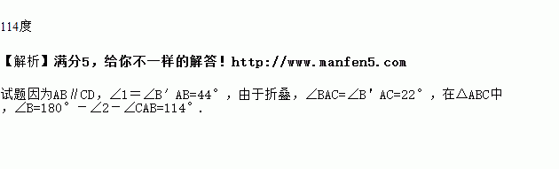 如图,将平行四边形ABCD沿对角线AC折叠,使点B落在点B' 处,若∠1=∠2=44°,则∠B的大小为_________度.